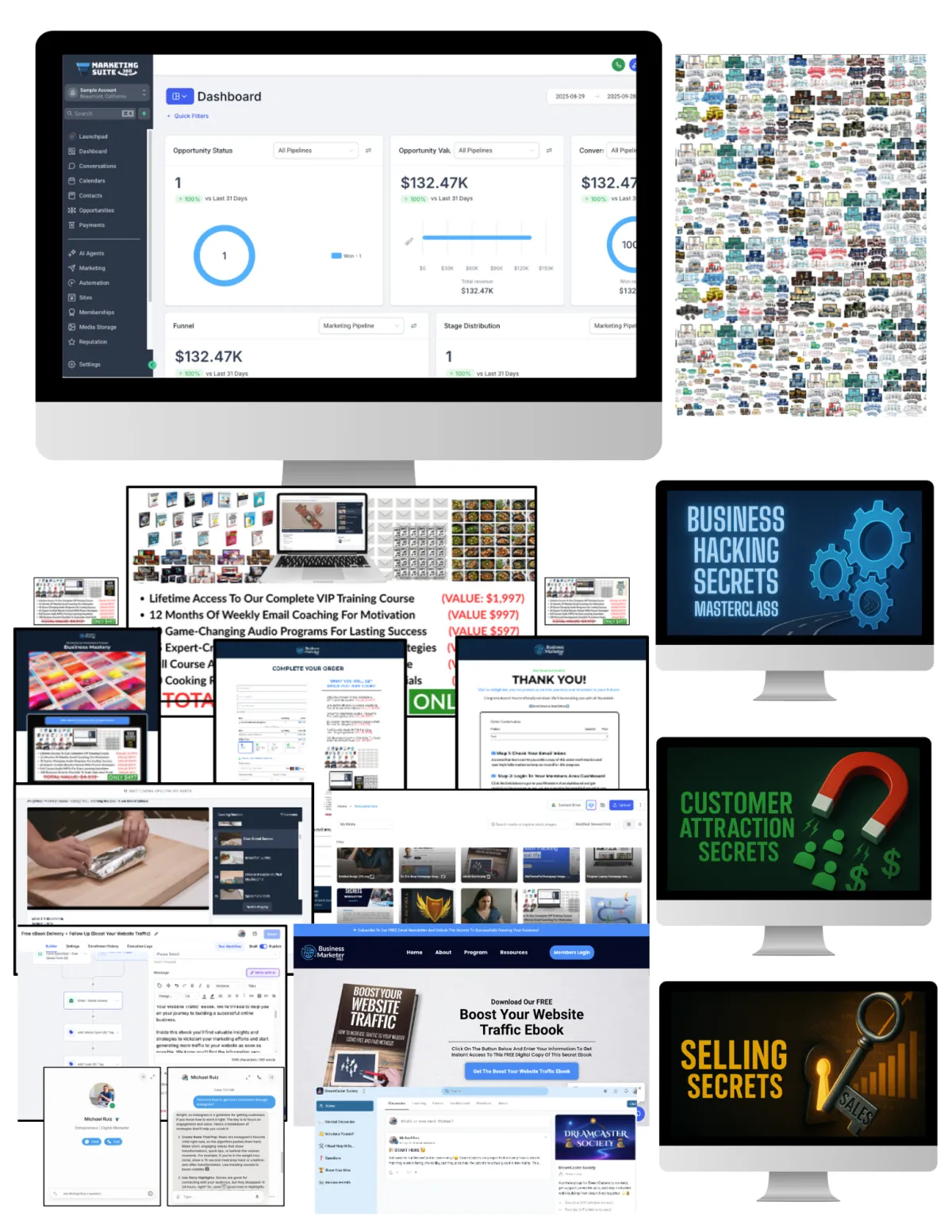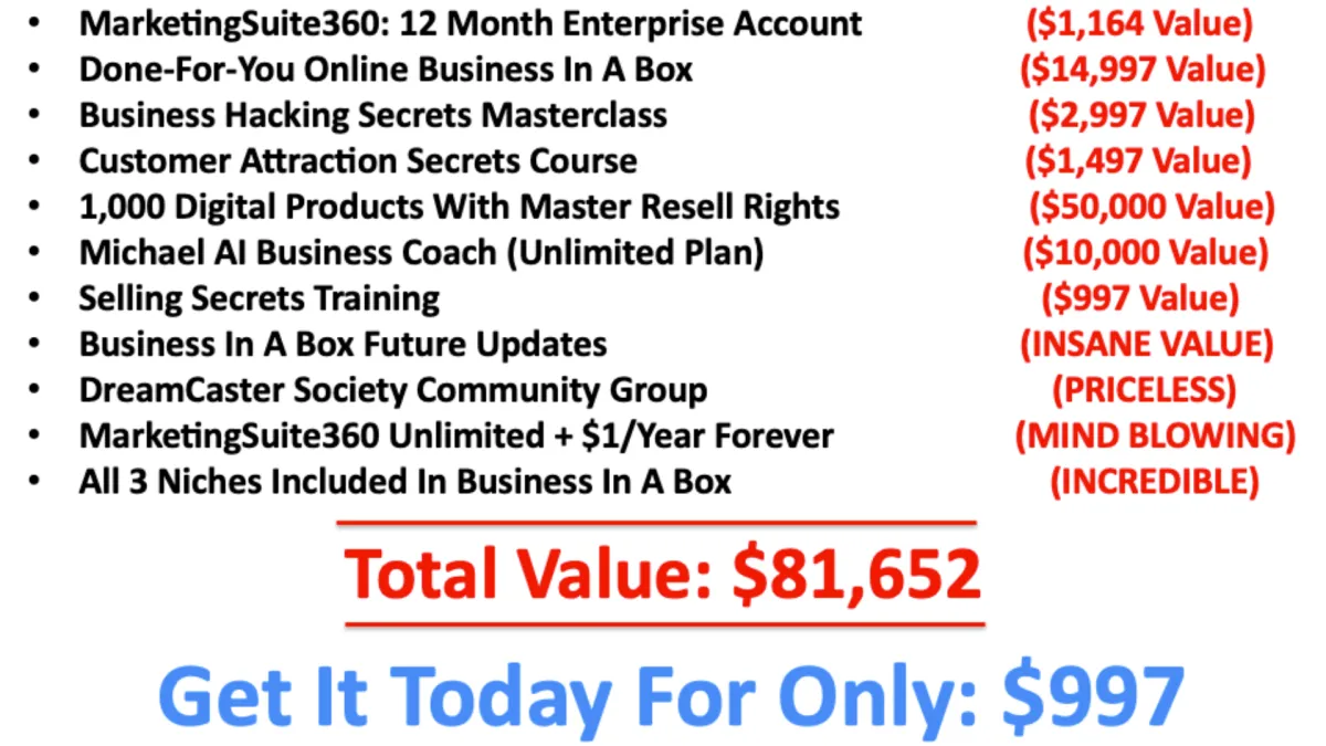You will receive access to MarketingSuite360 along with the online business in a box assets which will be preloaded into your account which includes websites, funnels, automations, and a lot more. You'll also receive the trainings needed to get launched and start bringing in customers. This includes the Business Hacking Secrets Masterclass, Customer Attraction Secrets Course, and the Selling Secrets training. Additionally, you'll receive 1,000 digital products with master resell rights, Michael AI Business Coach, Business In A Box Future Updates, and the DreamCaster Society Community Group.